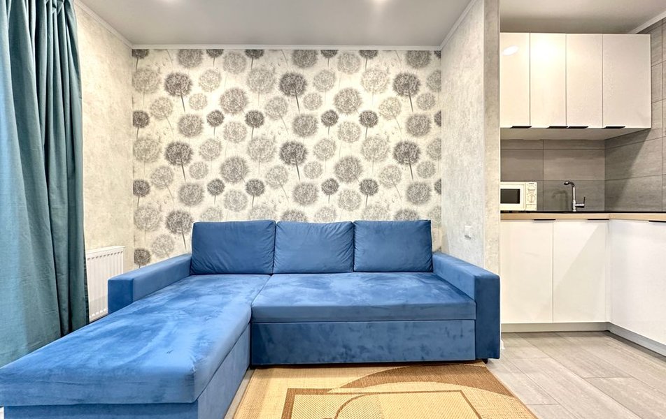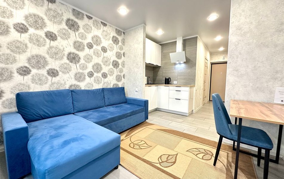 Апартаменты разместились в жилом квартале «Легенда парк» на 6 этаже в 20-этажном доме с лифтом. К услугам гостей уютная студия с балконом, зонированная с учетом потребностей гостей. Установлен двуспальный диван с оттоманкой, угловой кухонный гарнитур, который совмещает лаконичность и функционал. Имеется вся необходимая посуда и бытовая техника. Санузел совмещенный, с ванной, есть стиральная машина, фен, средства гигиены. Для большего комфорта постояльцев предусмотрен доступ к беспроводному интернету. Имеются гладильные принадлежности.