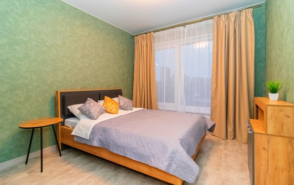 Апартаменты разместились в 9-этажном доме по улице Газовиков. Интерьер выполнен в спокойных светлых тонах, панорамные окна дают много света, а оснащение комфортной мебелью и бытовой техникой позволяет почувствовать себя как дома. Кухня укомплектована всем необходимым: индукционной плитой, духовым шкафом, полноразмерным холодильником и другой техникой. В гостиной - круглый обеденный стол, в спальне – большая двухспальная кровать, также есть два дивана, просторная гардеробная, телевизор со Smart TV, доступ к Wi-Fi. Санузел совмещенный, в распоряжении гостей ванна, приготовлен набор косметики, фен, установлена стиральная машина.