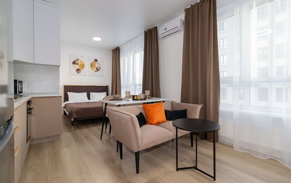 Апартаменты представляют собой уютную однокомнатную студию на седьмом этаже, рассчитанную на двоих гостей. Просторная комната объединена с кухней. К услугам гостей — большая двуспальная кровать, небольшой диванчик в зоне отдыха, SMART-телевизор с кабельными каналами и высокоскоростной беспроводной интернет.