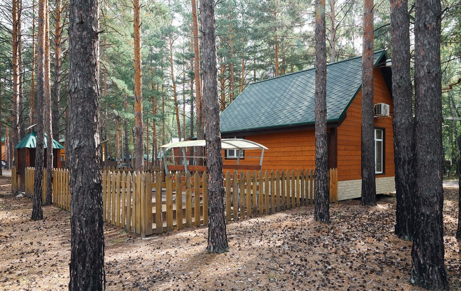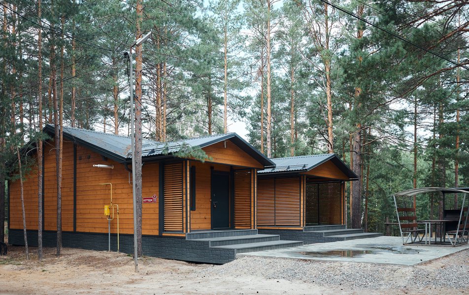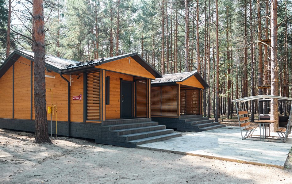 Экопарк представляет собой комплекс из одиннадцати одно- и двухэтажных коттеджей разной вместимости. Все дома выполнены из экологичного материала и принимают гостей круглый год. Внутри каждого коттеджа — спальные места, просторная гостиная с обеденной зоной и диванами. На кухне - базовый набор бытовой техники, в семейном коттедже - с плитой для самостоятельного приготовления еды. В некоторых домах установлен кондиционер и теплые полы. В каждом коттедже - по одному или два санузла, в ряде домов нет душевых. Для досуга имеется телевизор с функцией смарт ТВ, интернет wi-fi.