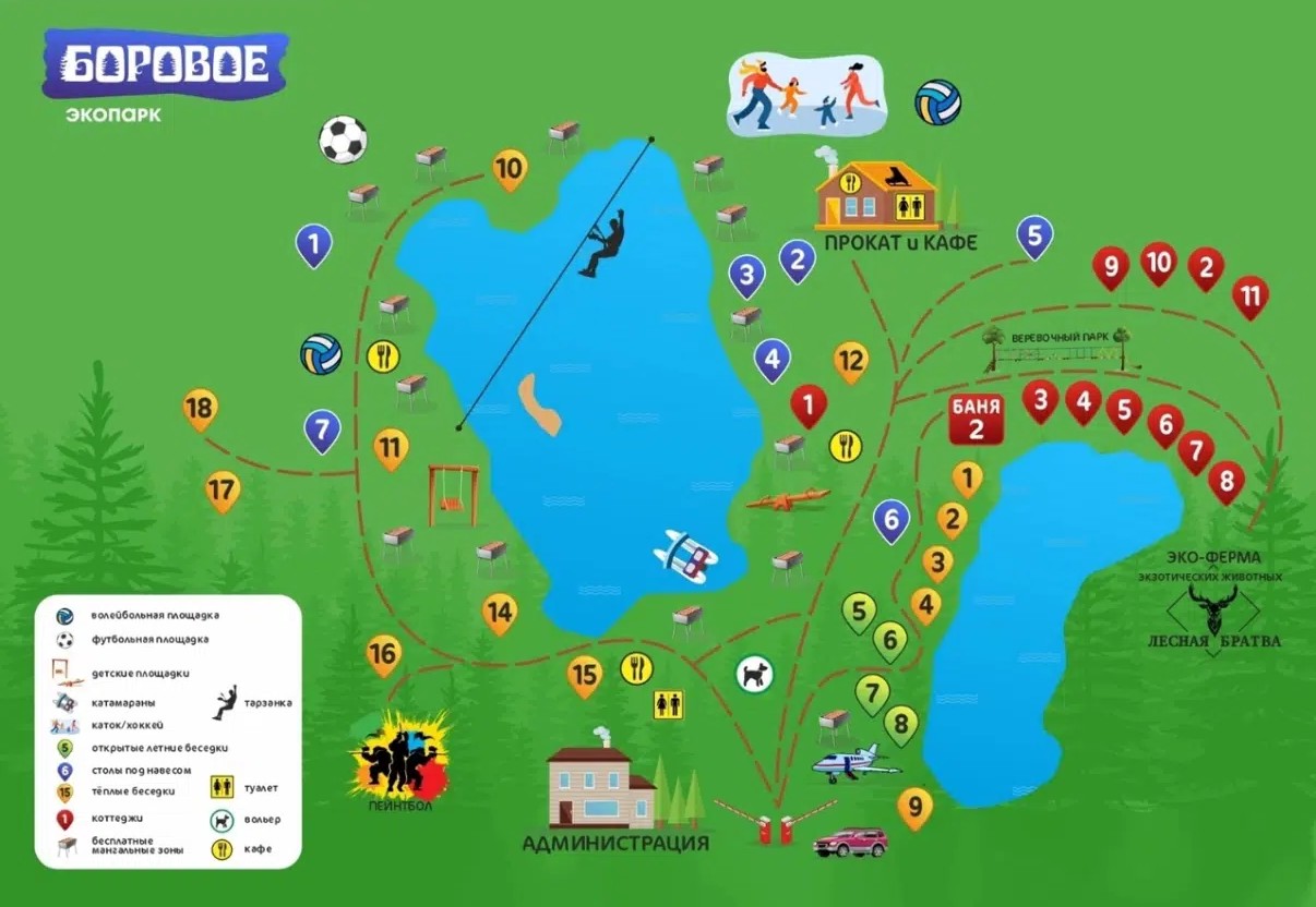 Экопарк «Боровое» расположена юго-восточнее Тюмени, в 30 минутах езды от ее центральных улиц. Она разместилась на берегу живописного озера в сосновом лесу. Рядом нет крупных торговых центров или шумных трасс — только лес и вода. Ближайшие населенные пункты в нескольких километрах, поэтому на территории есть все необходимое для комфортного пребывания.