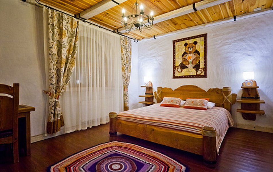 Двухэтажное здание с мансардной построено по авторскому проекту. Номеров немного, и это создает уютную атмосферу внутри отеля. Гостям предлагаются номера категории Стандарт, Полулюкс, Люкс, также с авторскими интерьерами и с расписанными вручную предметами мебельного гарнитура. Во всех номерах есть телевизор, кондиционер, ванная комната с душем.