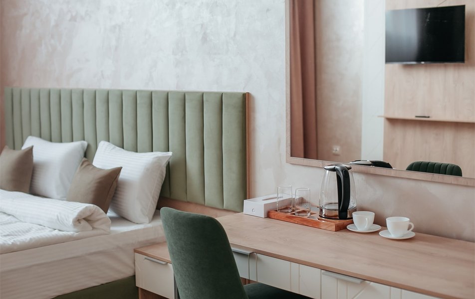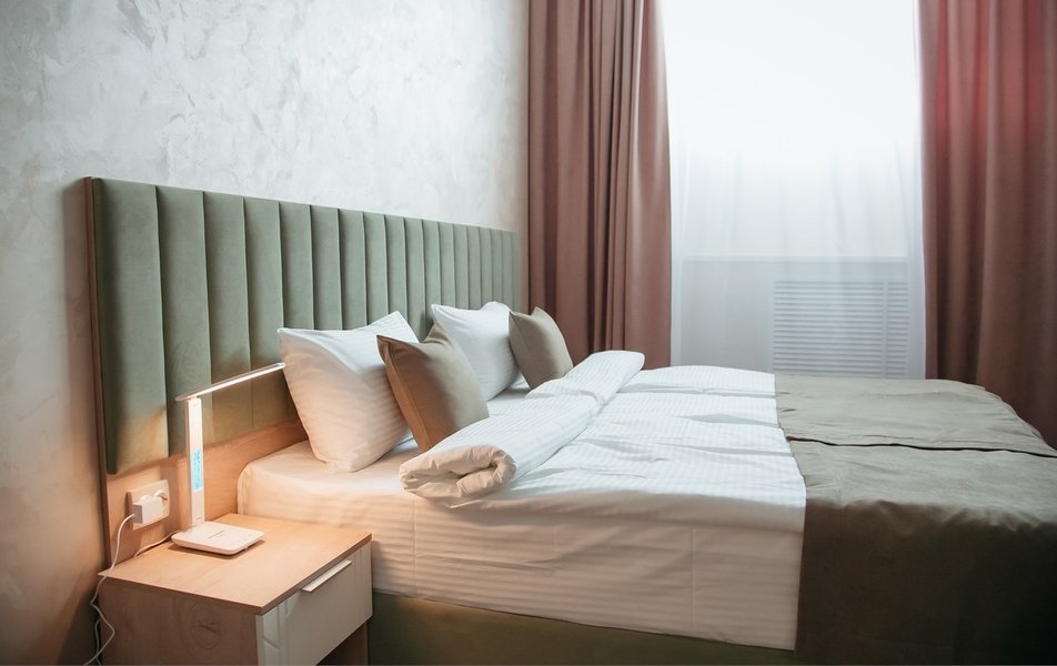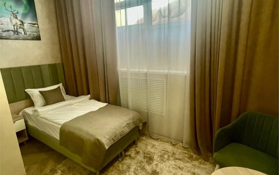 Гостиница расположена в микрорайоне Оптимистов в 6-этажном здании неподалеку от крупной городской артерии – улицы Магистральной. К гостинице ведут удобные подъездные пути, благоустроенная пешеходная зона, есть своя парковка. Для проживания предлагаются 13 комфортабельных номеров. В каждом – персональный санузел с душевой кабиной, халатами и предметами гигиены, сейф, ЖК-телевизор и телефон, утюг и гладильные принадлежности, мини-холодильник и чайная станция. В ряде номеров оборудована кухонная зона.