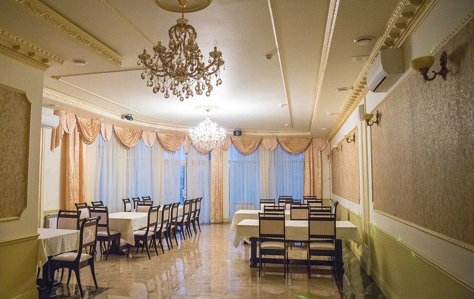 Интерьер в благородных светлых тонах. Столы рассчитаны на 9 человек, большая роскошная люстра хорошо освещает зал.