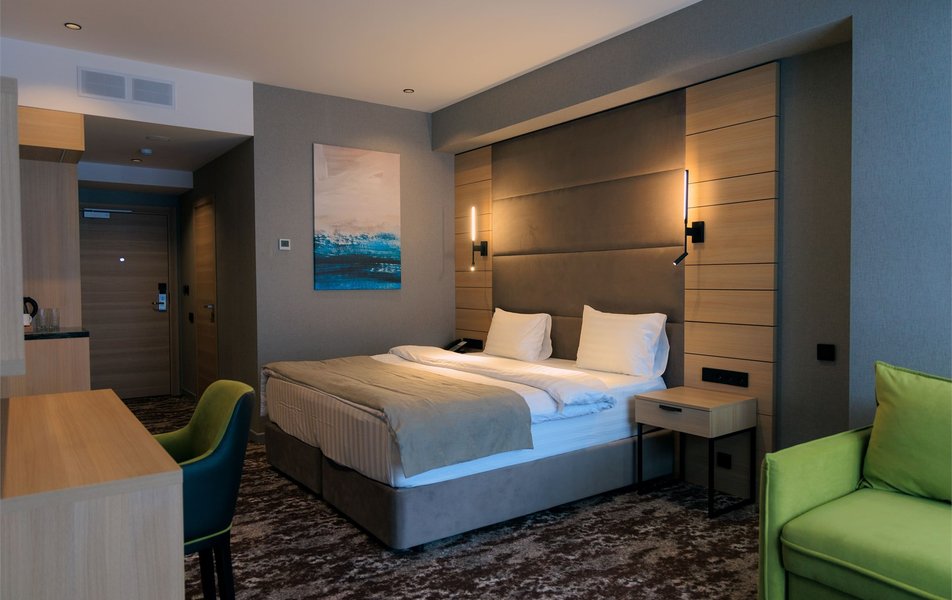 К размещению гостей предлагаются современные и уютные номера, рассчитанные на 2–4 человек. Светлый интерьер, продуманная планировка и функциональная мебель обеспечивают комфорт в любое время года. В номерах установлены двуспальные кровати с ортопедическими матрасами, телевизор, холодильник, шкаф, кондиционер и собственная ванная комната с душевой, феном и туалетными принадлежностями. В части номеров оборудованы балконы с видом на горы.