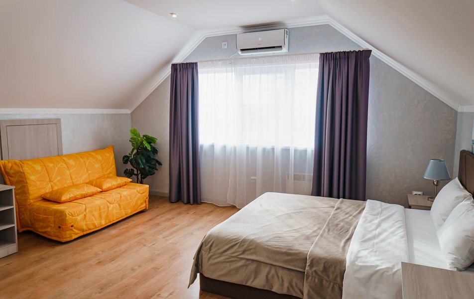 В каждом номере, кроме мебели, имеются кондиционер, smart TV, мини-холодильник, электрочайник. В санузле - душ, комплект полотенец для каждого гостя, косметические наборы, фен.