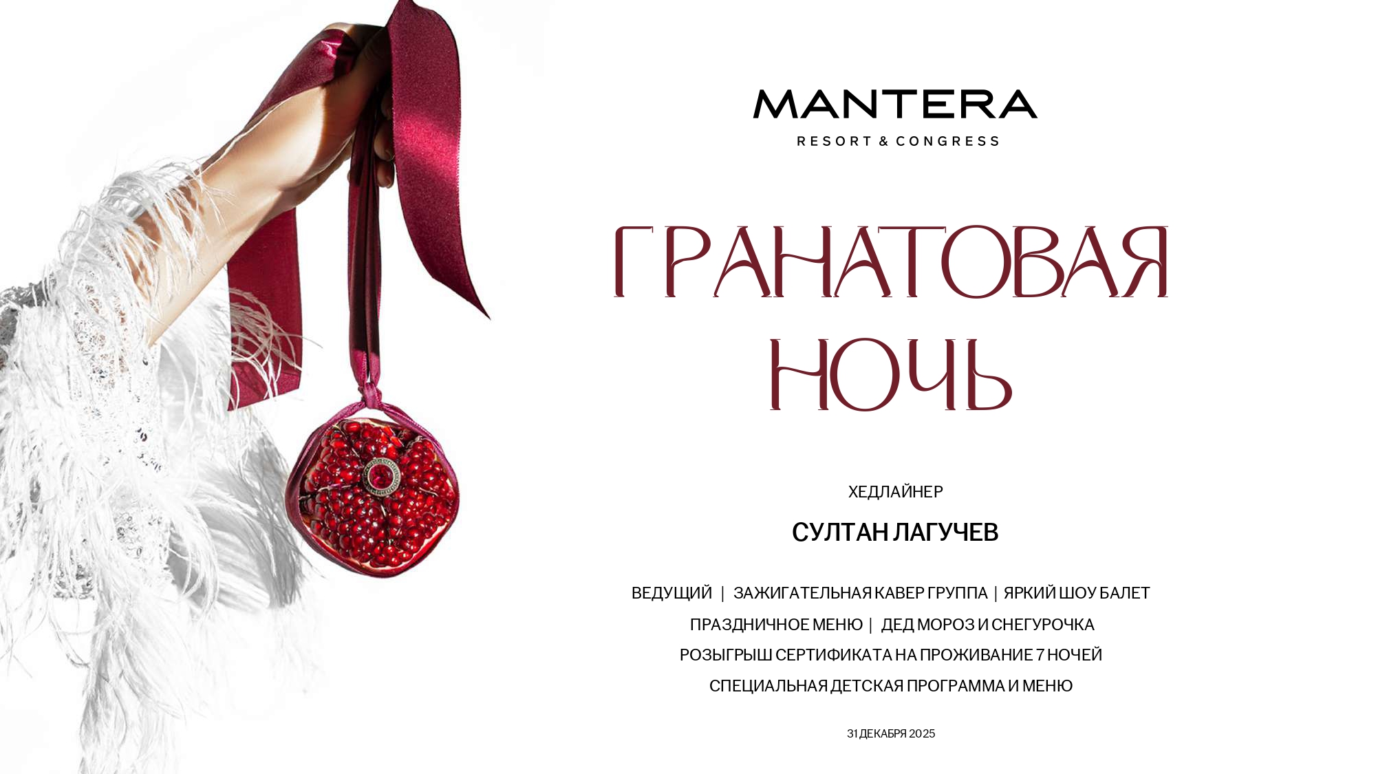 Приглашаем провести незабываемую новогоднюю ночь в стиле «Гранатовая ночь» в зале «Премьер» отеле MANTERA RESORT & CONGRESS!