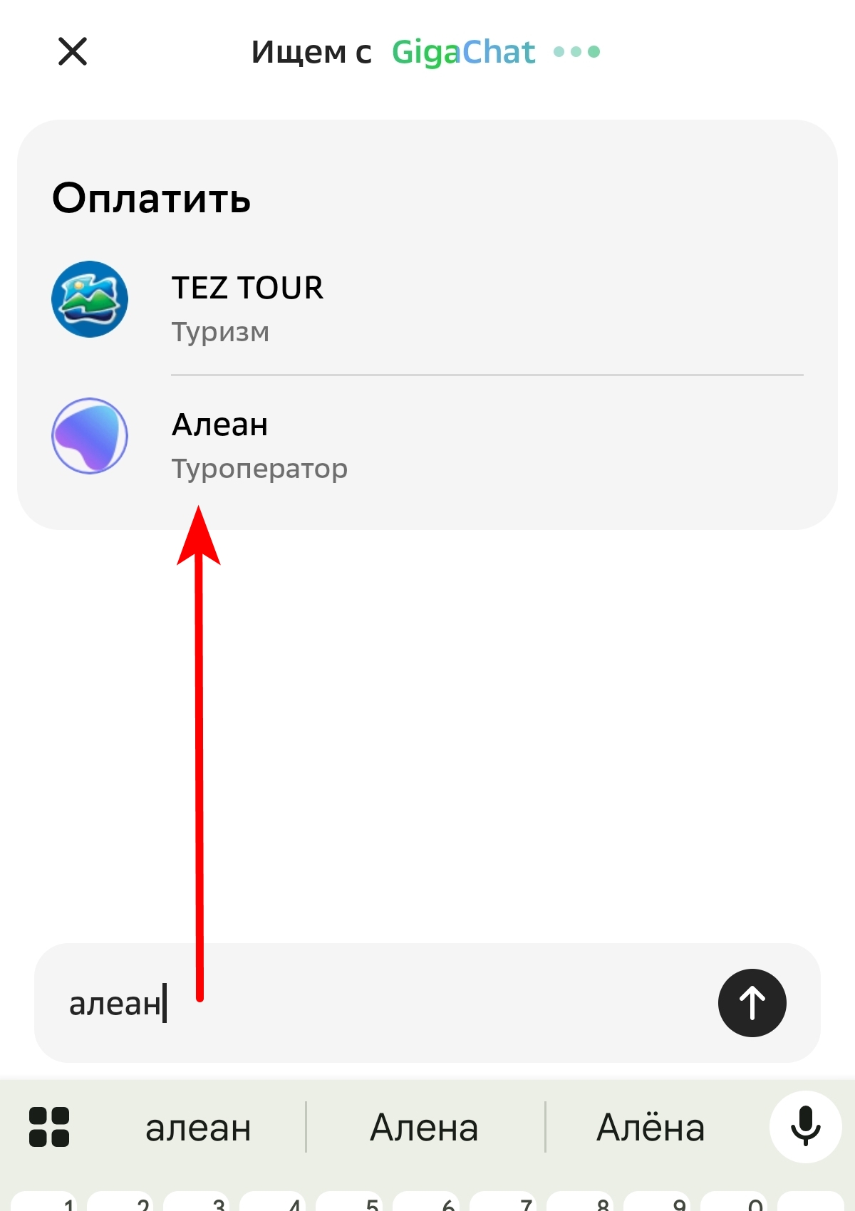 2. В поисковой строке введите "Алеан", в результате поиска выберите "Алеан Туроператор"
