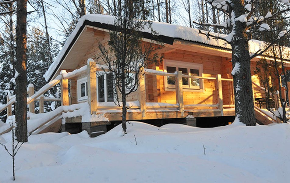Деревянный коттедж рассчитан на размещение 10 детей + 2 взрослых. В зимнее время коттедж отапливается. Дети спят на кроватях в спальных мешках. Имеется кухня-столовая с камином.
