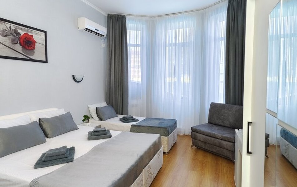 Трехэтажный корпус отеля разместился на главной туристической улице – Пионерском проспекте на первой береговой линии. К услугам гостей разные по категории номера с балконом и без. В каждом номере установлена сплит-система, есть ЖК-телевизор и мини-холодильник, в бюджетных номерах общий санузел, который находится на этаже.
