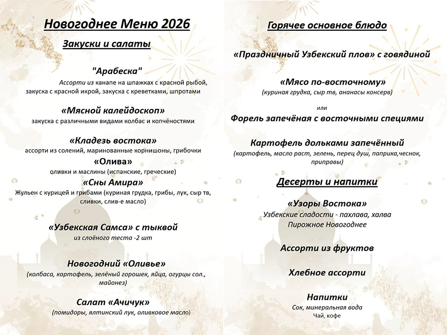 | Рестораны и бары | столовая: европейская и узбекская кухня, с 9:00 до 20:00 фитобар |