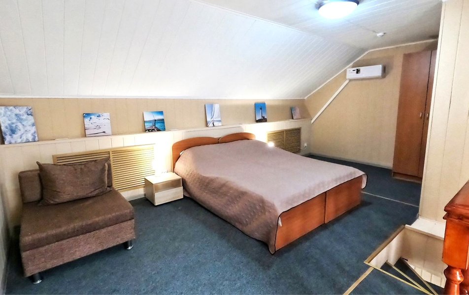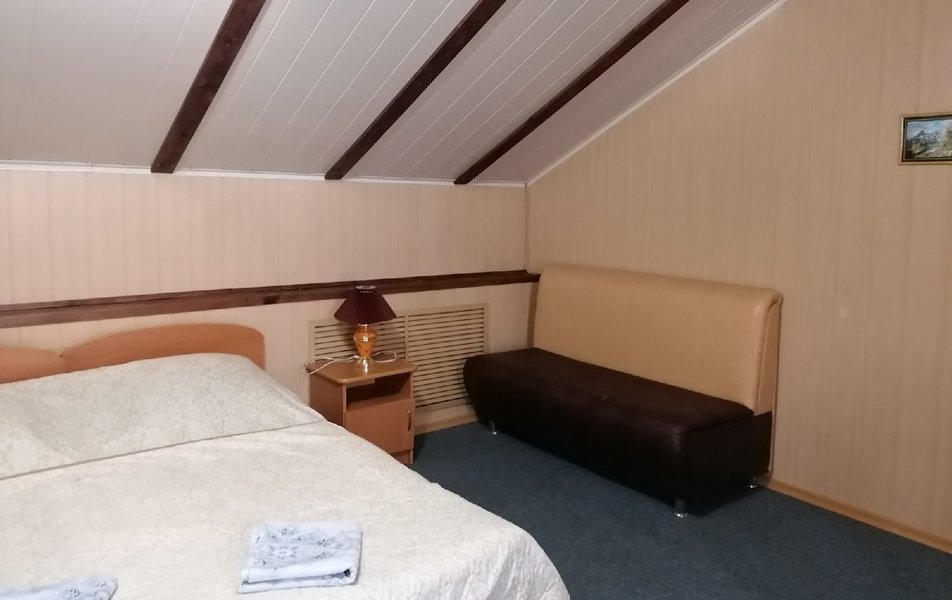 Территория гостиницы занимает небольшую, компактно организованную площадь, в жилом секторе поселка. Внешне обычный, отель отличается оригинальной внутренней архитектурой. Жилая часть корпуса разделена на две «улицы», между которыми проходит импровизированный дворик с бильярдными столами, зонами отдыха и детским батутом. Всего для размещения предусмотрено несколько видов номеров, в том числе двухэтажные. Часть номеров прошла реновацию, обновлена мебель, техника, текстиль. Все номера оборудованы душевыми, санузлами, телевизорами, Wi-Fi, холодильниками, чайниками и чайными наборами посуды. В некоторых номерах своя мини-кухня.